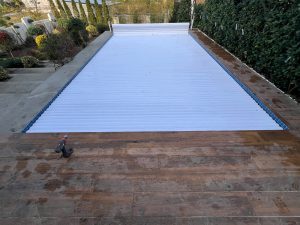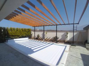 3. برش و نصب کاور: کاور یو پی وی سی بر اساس ابعاد استخر برش داده شده و نصب می‌شود.